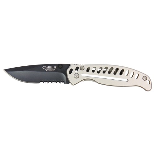 The Camillus EDC3 Folding Knife is the ultimate everyday carry tool, engineered for both utility and durability. With an overall length of 6.75 inches, this knife features a drop point blade treated with Carbonitride Titanium, enhancing its hardness and resistance to wear. The sleek black blade, made from high-quality AUS-8 steel, boasts a partial serration and hollow grind, making it versatile for a range of cutting tasks. The stainless steel handle, finished in a striking silver color, is designed for ambidextrous use and provides a comfortable, secure grip. The liner lock mechanism ensures safe operation, and the knifeās Rockwell Hardness of HRC56 guarantees exceptional edge retention. Backed by a lifetime warranty, the Camillus EDC3 Folding Knife is a reliable companion for any adventure.