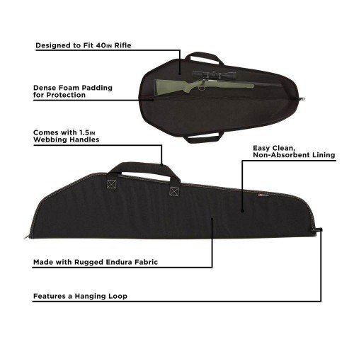 FOR RIFLES: The Durango Rifle Case fits most models for both hunting and the shooting range, providing a secure and snug fit for optimal protection.SOFT CASE: This 40-inch gun bag has dense foam padding and rugged endura fabric that protects against scratches, dings, and other potential damages.VERSATILE USAGE: This case can also be used for any long gun under 40 inches, making it a versatile addition to your hunting and shooting accessories.EASY TO CARRY: The case's 1.5-inch webbing handles and hanging loop make transporting your gun to and from any location easy.ALLEN CO: We share your passion for the great outdoors. Our unwavering dedication lies in crafting superior hunting, shooting, and archery gear that combines quality and value.OVERALL DIMENSIONS: Designed to fit a 40" rifle/shotgun; Exterior Measures: 42"L x 9.5"W x 1"H, Interior Measures: 39.5"L x 9"W.